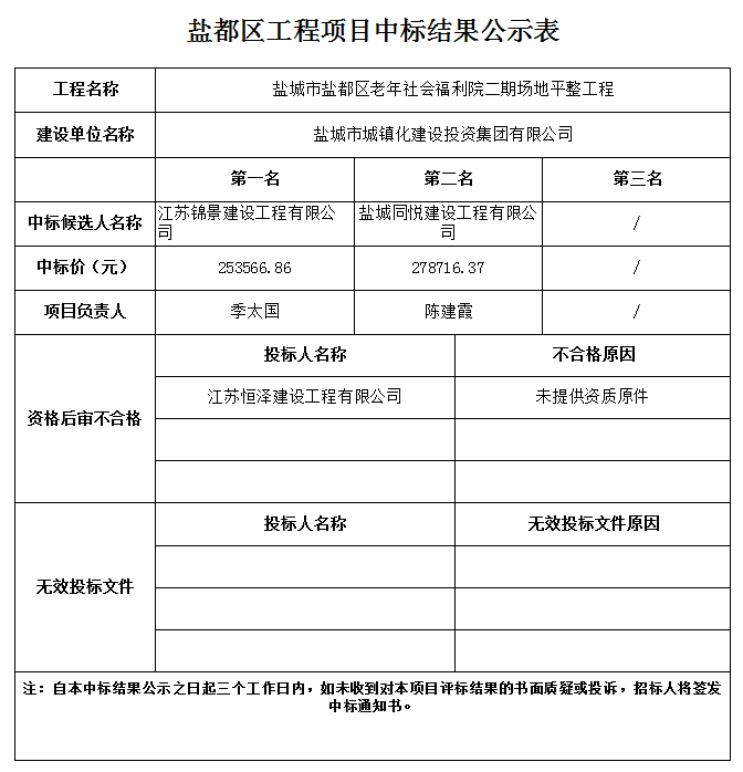 鹽城市鹽都區(qū)老年社會福利院二期場地平整工程中標(biāo)結(jié)果公示