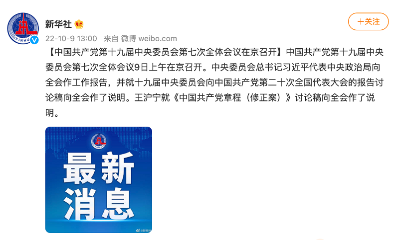 【中國(guó)共產(chǎn)黨第十九屆中央委員會(huì)第七次全體會(huì)議在京召開】中國(guó)共產(chǎn)黨第十九屆中央委員會(huì)第七次全體會(huì)議9日上午在京召開。中央委員會(huì)總書記習(xí)近平代表中央政治局向全會(huì)作工作報(bào)告,并就十九屆中央委員會(huì)向中國(guó)共產(chǎn)黨第二十次全國(guó)代表大會(huì)的報(bào)告討論稿向全會(huì)作了說(shuō)明。王滬寧就《中國(guó)共產(chǎn)黨章程(修正案)》討論稿向全會(huì)作了說(shuō)明。